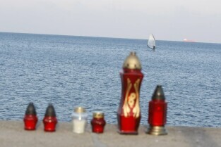 Gdańsk, Molo w Brzeźnie. Dzień Wszystkich Świętych, znicze ustawione ku pamięci tych, co zginęli na morzu