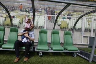 Gdańsk Letnica. Dzień otwarty stadionu piłkarskiego PGE Arena, którego ideą jest podsumowanie UEFA Euro 2012 i podziękowanie gdańszczanom za współorganizację mistrzostw w Gdańsku. Nz. Prezydent Gdańska Paweł Adamowicz z córką Teresą