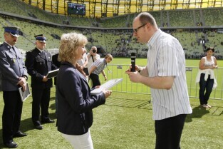 Gdańsk Letnica. Dzień otwarty stadionu piłkarskiego PGE Arena, którego ideą jest podsumowanie UEFA Euro 2012 i podziękowanie gdańszczanom za współorganizację mistrzostw w Gdańsku. Nz. Prezydent Gdańska Paweł Adamowicz wręcza przedstawicielom służb miejskich podziękowanie za organizację mistrzostw w Gdańsku