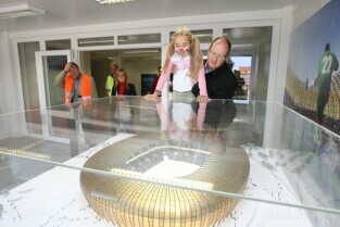 Gdańsk Letnica. Dzień otwarty na budowie stadionu piłkarskiego na UEFA EURO 2012. Nz. Paweł Adamowicz pokazuje córce Antoninie makietę stadionu