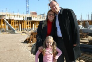Gdańsk Letnica. Dzień otwarty na budowie stadionu piłkarskiego na UEFA EURO 2012. Nz. Paweł Adamowicz z żoną Magdaleną i córką Antoniną w miejscu, gdzie będzie murawa