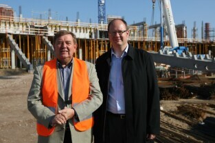 Gdańsk Letnica. Dzień otwarty na budowie stadionu piłkarskiego na UEFA EURO 2012. Nz. Prezydent Gdańska Paweł Adamowicz i Prezes BIEG 2012 Ryszard Tyrkosko