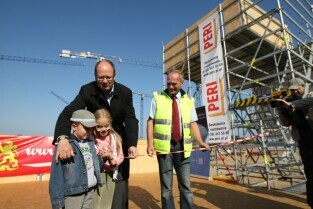 Gdańsk Letnica. Dzień otwarty na budowie stadionu piłkarskiego na UEFA EURO 2012. Nz. Prezydent Gdańska Paweł Adamowicz otwiera platformę widokową przy ul. Żaglowej, z której można oglądać postęp prac przy budowie stadionu