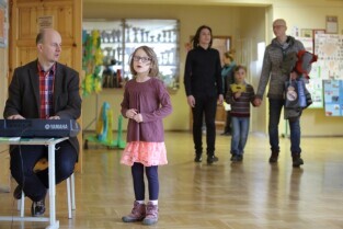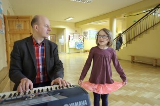 Gdańsk. Dzień otwarty w Szkole Podstawowej nr 50 im. Emilii Plater. Nz. Nauczyciel Muzyki mgr. Grzegorz Wachulski.