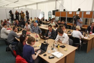 Centrum Medialne na Targu Węglowym. Konferencja prasowa podsumowującą pierwszy mecz UEFA EURO 2012 rozegrany na gdańskim stadionie.