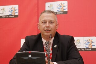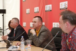 Centrum Medialne na Targu Węglowym. Konferencja prasowa podsumowującą pierwszy mecz UEFA EURO 2012 rozegrany na gdańskim stadionie. Nz. Szef Miejsko–Wojewódzkiego Sztabu Operacyjnego UEFA EURO 2012 w Gdańsku Andrzej Bojanowski.