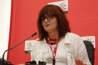 Centrum Medialne na Targu Węglowym. Konferencja prasowa podsumowującą pierwszy mecz UEFA EURO 2012 rozegrany na gdańskim stadionie. Nz. Koordynator ds. Wolontariatu Magdalena Skiba.