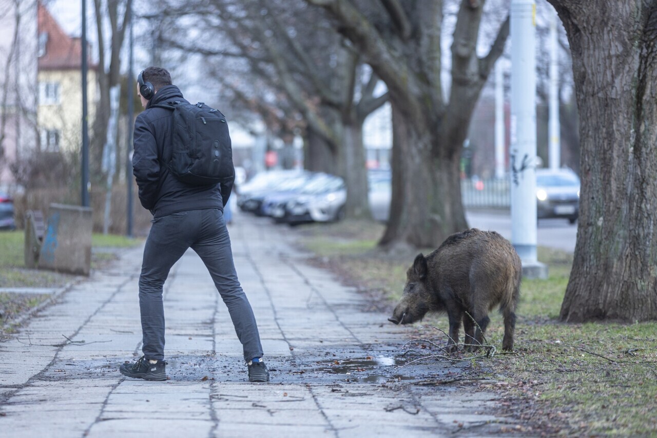Gdańsk. Nie zwracając uwagi na przechodzących obok ludzi, dwa młode dziki poszukują jedzenia na trawniku, przy ul. Wojska Polskiego, w dzielnicy Strzyża.