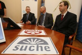 Gdańsk, Urząd Miejski. Konferencja prasowa, na której przedstawiono zwycięzce w konkursie na projekt EkoPojemnika do domowej dualnej segregacji odpadów. Nz. od lewej: Z-ca Prezydenta Gdańska Andrzej Bojanowski, Prezes Zakładu Utylizacyjnego w Gdańsku Szadółkach Wojciech Głuszczak, Dyrektor Wydziału Środowiska UMG Maciej Lorek