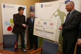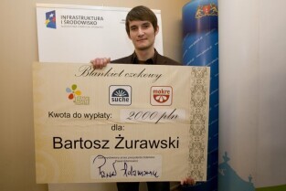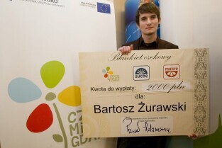 Gdańsk, Urząd Miejski. Konferencja prasowa, na której przedstawiono zwycięzce w konkursie na projekt EkoPojemnika do domowej dualnej segregacji odpadów. Nz. zwycięzca konkursu Bartosz Żurawski