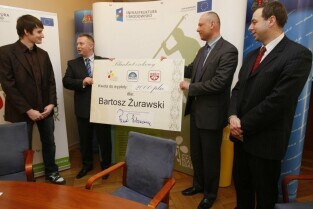 Gdańsk, Urząd Miejski. Konferencja prasowa, na której przedstawiono zwycięzce w konkursie na projekt EkoPojemnika do domowej dualnej segregacji odpadów. Nz. od lewej: zwycięzca konkursu Bartosz Żurawski, Z-ca Prezydenta Gdańska Andrzej Bojanowski, Prezes Zakładu Utylizacyjnego w Gdańsku Szadółkach Wojciech Głuszczak, Dyrektor Wydziału Środowiska UMG Maciej Lorek