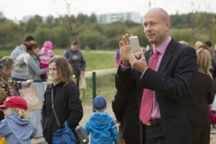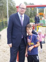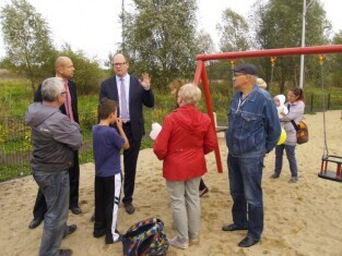 Gdańsk, Zakoniczyn. Otwarcie "Ekologicznego Placu Zabaw", który powstał z komponentów pochodzących recyklingu. Fundatorem placu jest Zakład Utylizacyjny w Gdańsku. Nz. Prezydent Gdańska Paweł Adamowicz