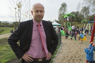 Gdańsk, Zakoniczyn. Otwarcie "Ekologicznego Placu Zabaw", który powstał z komponentów pochodzących recyklingu. Fundatorem placu jest Zakład Utylizacyjny w Gdańsku. Nz. Prezes Zakładu Utylizacyjnego Sp. z o.o. Wojciech Głuszczak