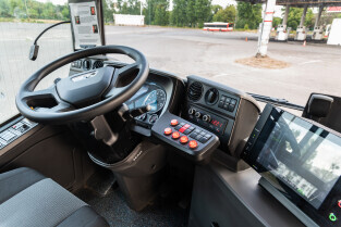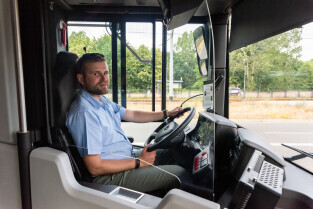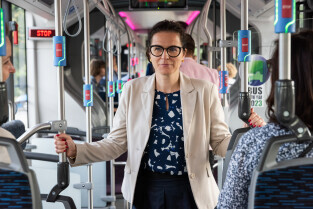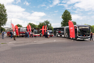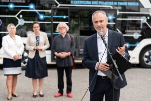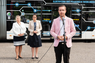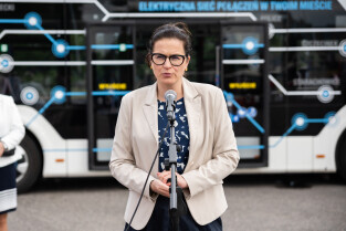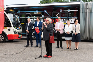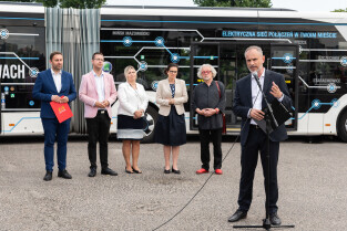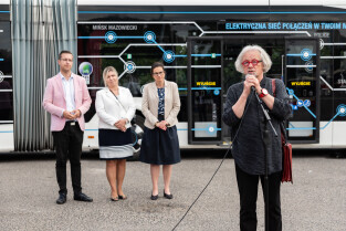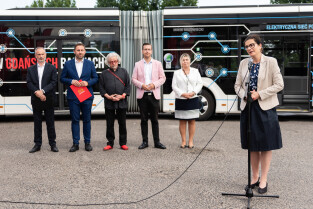 Gdańsk, zajezdnia autobusowa, ul. Hallera 142. Elektryczny autobus MAN na testach w Gdańsku. Obecni m.in. prezydent Gdańska Aleksandra Dulkiewicz, z-ca prez. Piotr Borawski