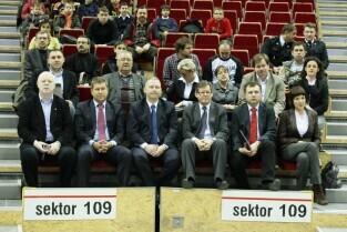 Ergo Arena, hala na granicy Gdańska i Sopotu, działa już pół roku. Na terenie hali zorganizowana została konferencja prasowa podsumowująca dotychczasową działalność i przedstawiono plany na 2011 rok. Nz. od prawej: Dyrektor Biura Marketingu i PR Ergo Hestii Katarzyna śliwińska, Prezydent Sopotu Jacek Karnowski, Minister Sportu i Turystyki Adam Giersz, Z-ca Prezydenta Gdańska Andrzej Bojanowski, nn, Prezes Trefl Sopot Kazimierz Wierzbicki