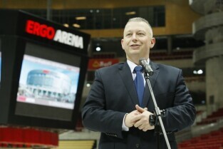 Ergo Arena, hala na granicy Gdańska i Sopotu, działa już pół roku. Na terenie hali zorganizowana została konferencja prasowa podsumowująca dotychczasową działalność i przedstawiono plany na 2011 rok. Nz. Prezydent Sopotu Jacek Karnowski
