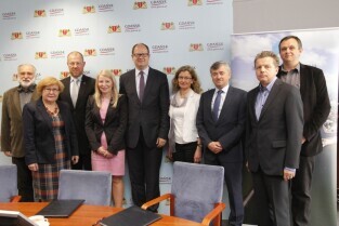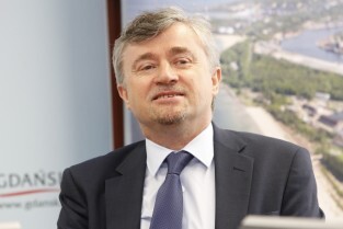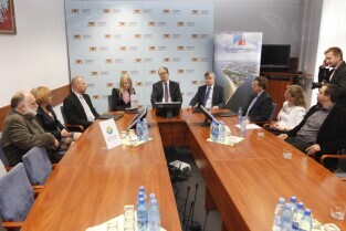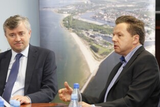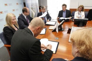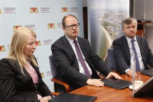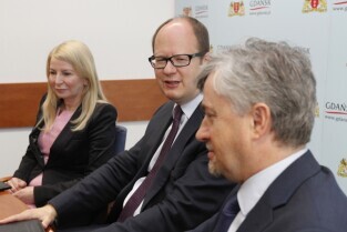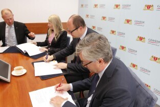 Urząd Miejski w Gdańsku. Podpisanie umowy partnerstwa z Zarządem Morskiego Portu Gdańsk i trójmiejskimi uczelniami dotyczącej wspólnej realizacji projektu "Estetyzacja Portu w Gdańsku". Umowę podpisał m.in. prezydent Gdańska Paweł Adamowicz.