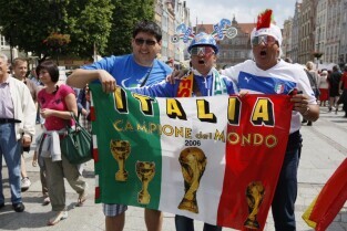 Ulice Głównego Miasta opanowane przez rozbawiony tłum kibiców z Hiszpanii i Włoch w przeddzień meczu obu drużyn na gdańskim stadionie. Drużynowa konkurencja nie przeszkadza w pozowaniu do wspólnych zdjęć i powitań. Gdańsk, Droga Królewska
