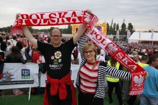 Gdańsk, Plac Zebrań Ludowych. Strefa Kibica (Fun Zone) podczas Mistrzostw UEFA Euro 2012. Mecz Polska-Czechy, który obejrzało blisko 40 tys. kibiców. Spotkanie zakończyło się wygraną Czechów 1:0. Nz. Prezydent Gdańska Paweł Adamowicz z żoną Magdaleną