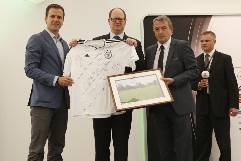 Gdańsk Oliwa, Centrum Prasowe Reprezentacji Niemiec na czas mistrzostw piłkarskich UEFA Euro 2012. Pożegnianie Reprezentacji Niemiec w piłce nożnej, która na czas półfinałów przenosi się do Warszawy, a jeśli awansuje do Kijowa. Nz. pożegnanie z udziałem Prezydenta Gdańska Pawła Adamowicza (w środku), Prezesa Niemieckiej Federacji Piłkarskiej DFB Wolfganga Niersbacha (po prawej) i Menadżera Reprezentacji Niemiec Olivera Bierhoffa (po lewej)