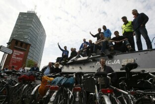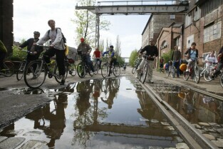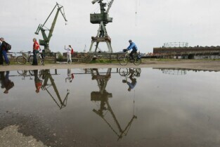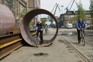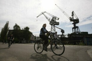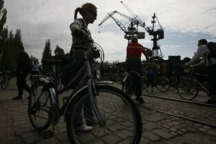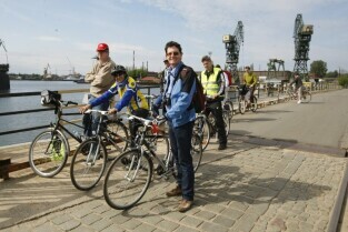 Delegaci Europejskiej Federacji Cyklistów w Gdańsku, gdzie na rowerach zwiedzali m.in. Wystawę Drogi do Wolności i Stocznię Gdańską
