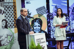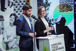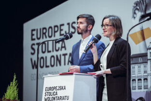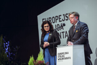 Gdańsk, ECS. Europejska Stolica Wolontariatu. Gala podczas, której Gdańsk przekazał tytuł Europejskiej Stolicy Wolontariatu norweskiemu Trondheim. Nz. Dr Monika Popow, pełnomocniczka Prezydent Gdańsk ds. Europejskiej Stolicy Wolontariatu 2022 i Szymon Knitter Regionalne Centrum Wolontariatu w Gdańsku.