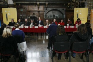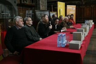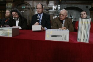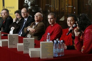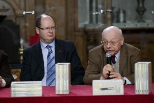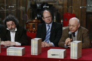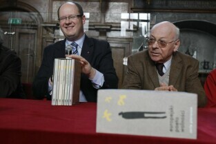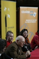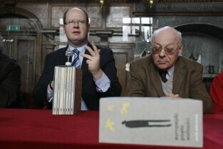Gdańsk, Dwór Artusa. Konferencja prasowa poświęcona Festiwalowi i Nagrodzie Literackiej Miasta Gdańska Europejski Poeta Wolności. Nz. Przewodniczący Jury Nagrody Krzysztof Pomian (po prawej) i Prezydent Gdańska Paweł Adamowicz