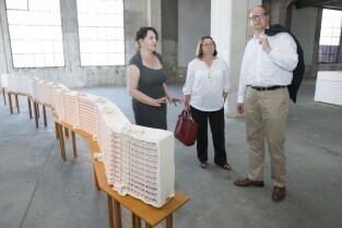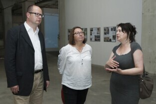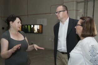 Festiwal Alternativa 2013 - wystawa w Hali 90B Stoczni Gdańskiej, którą odwiedzili Prezydent Gdańska Paweł Adamowicz (po prawej) i Dyrektor Biura Prezydenta Gdańska ds. Kultury Anna Czekanowicz-Drążewska (w środku) w towarzystwie Dyrektora Artystycznego Festiwalu Anety Szyłak (po lewej)