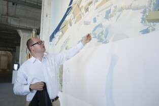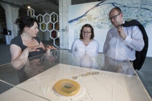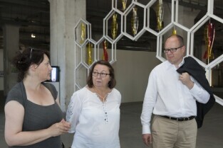 Festiwal Alternativa 2013 - wystawa w Hali 90B Stoczni Gdańskiej, którą odwiedzili Prezydent Gdańska Paweł Adamowicz (po lewej) i Dyrektor Biura Prezydenta Gdańska ds. Kultury Anna Czekanowicz-Drążewska (w środku) w towarzystwie Dyrektora Artystycznego Festiwalu Anety Szyłak (po prawej)