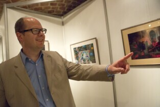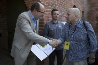 XVIII Międzynarodowy Festiwal Teatrów Plenerowych i Ulicznych FETA. Gdańsk, Centrum Hewelianum. Inauguracja Festiwalu oraz wernisaż wystawy FOTO FETA. Nz. Prezydent Gdańska Paweł Adamowicz wręcza I nagrodę w konkursie FOTO FETA, którą otrzymuje Adam Bogdan (po prawej)