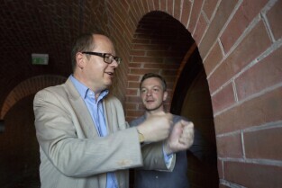 XVIII Międzynarodowy Festiwal Teatrów Plenerowych i Ulicznych FETA. Gdańsk, Centrum Hewelianum. Inauguracja Festiwalu oraz wernisaż wystawy FOTO FETA. Nz. Prezydent Gdańska Paweł Adamowicz i Kierownik Klubu Plama GAK Szymon Wróblewski otwierają wystawę
