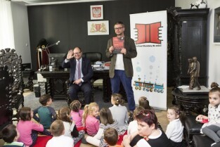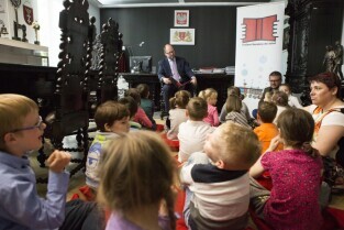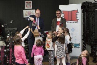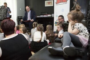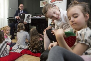 Czytanki po zmroku w ramach Europejskiej Nocy Literatury. Prezydent Gdańska Paweł Adamowicz w swoim gabinecie czyta dzieciom książkę w ramach Festiwalu Literatury dla Dzieci