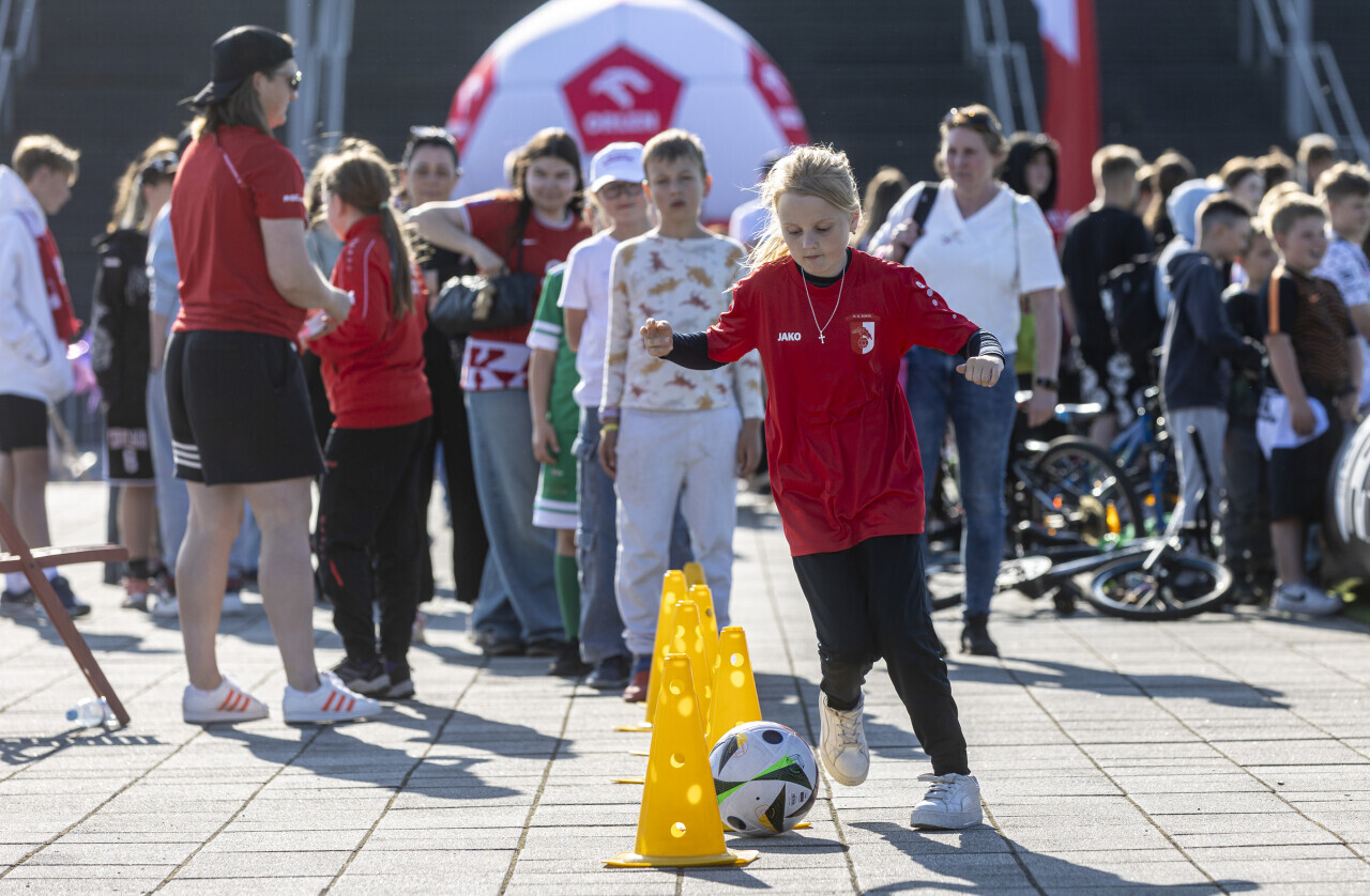 Gdańsk. Z okazji meczu reprezentacji Polski w piłce nożnej kobiet, obok stadionu Polsat Plus Arena odbył się festyn piłkarski dla dzieci pod hasłem "Festiwal Piłkarski dla Dziewczyn".