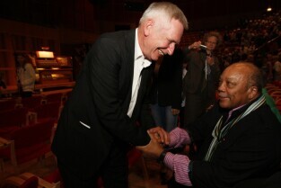 Koncert inauguracyjny Festiwal Solidarity of Arts 2012 pt. "W Poszukiwaniu Muzycznej Doskonałości " z udziałem: Maxim Vengerov, Roman Perucki, Maria Włoszczowska. Gdańsk, Filharmonia Bałtycka. Nz. Dyrektor Artystyczny Festiwalu Krzysztof Materna i muzyk Quincy Jones