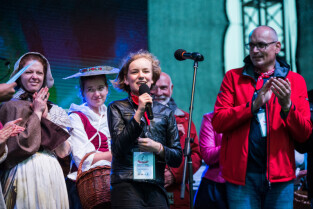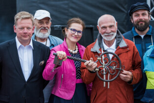 Gdańsk. Festiwal Szanty pod Żurawiem na Wyspie Ołowianka. Koncerty szantowe oraz Przekazanie kluczy Miasta Żeglarzom. Nz. (od lewej) Jacek Bendykowski, Aleksandra Dulkiewicz Z-ca Prezydenta ds. polityki gospodarczej i Kapitan Włodzimierz Przysiecki