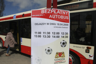 Specjalny autobus przewożący uczestników festynów z okazji przyznania Polsce i Ukrainie praw do organizacji EURO 2012 pomiędzy Letnicą i Długim Targiem