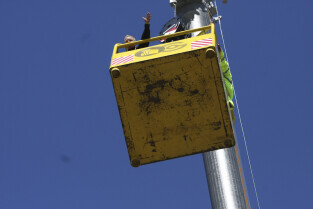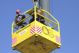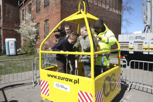 Gdańsk Letnica. Festyn z okazji 2. rocznicy przyznania Polsce i Ukrainie praw do organizacji EURO 2012. Nz. kosz, który dwig Żuraw Grohmann wynosił wraz z uczestnikami na wysokość 40 m, skąd można było z góry podziwiać budowę stadionu na Letnicy
