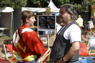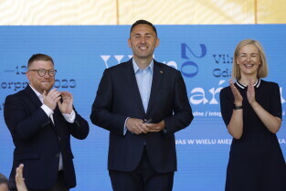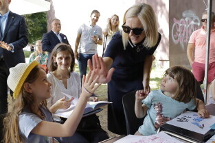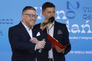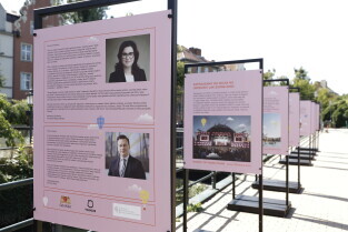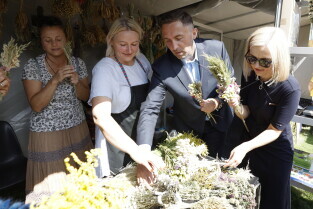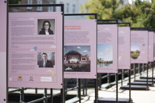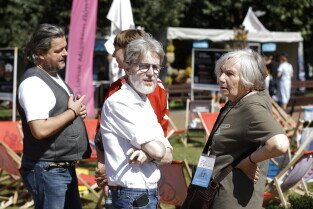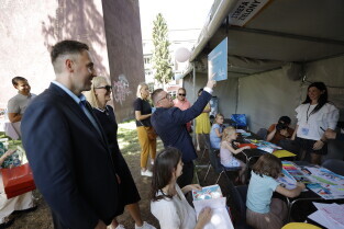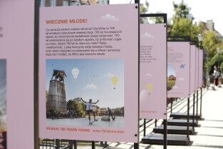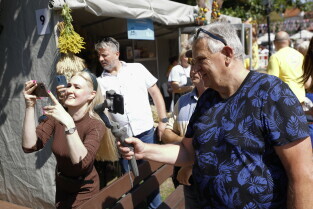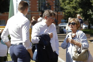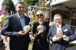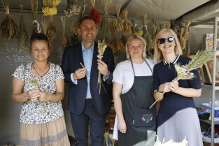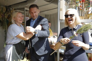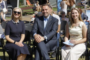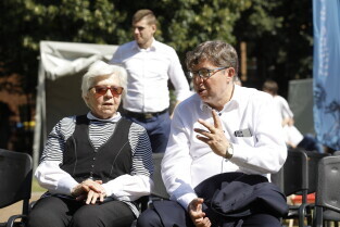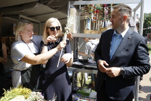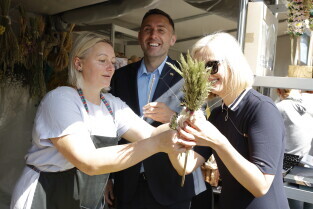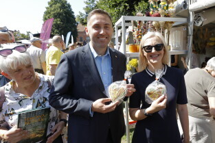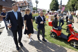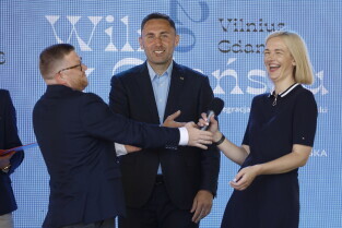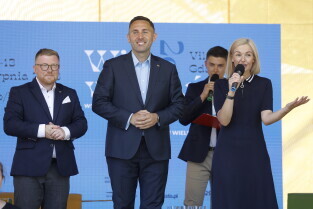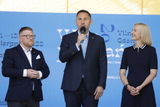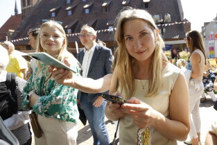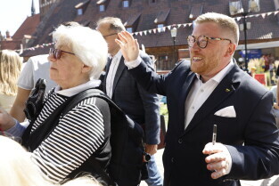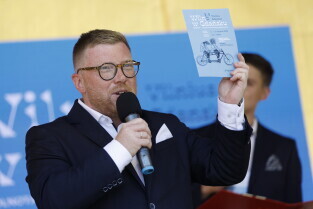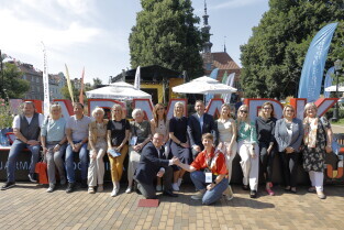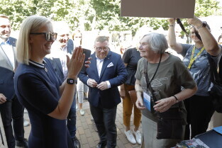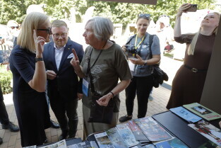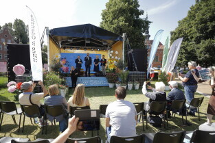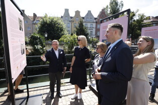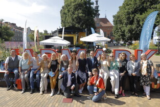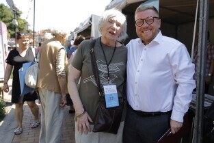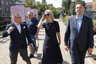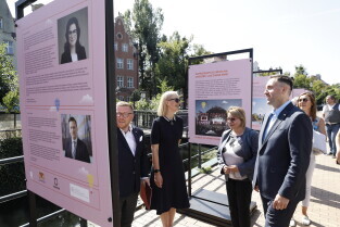 Gdańsk. Odwiedziny gości z Wilna wspólnie z władzami Gdańska w przestrzeni kultury wileńskiej na skwerze Heweliusza podczas Fetsiwalu Wilno w Gdańsku.
