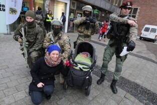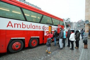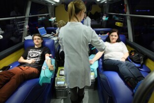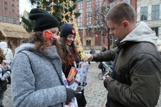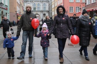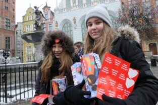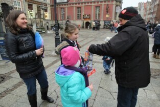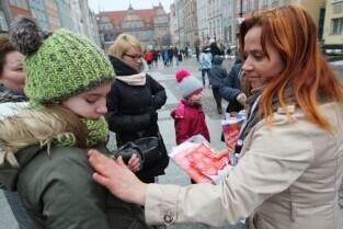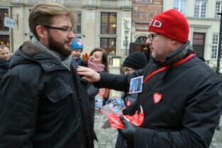 24 Finał Wielkiej Orkiestry Świątecznej Pomocy odbywa się w Gdańsku. Na Targu Węglowym można honorowo oddać krew. Nz Jan Najda i Pani Iwona z Gdańska.