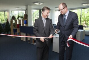 Otwarcie nowego biura Fineos - irlandzkiej firmy działającej w branży IT. Gdańsk Wrzeszcz, biurowiec w kompleksie Garnizon. Nz. Prezydent Gdańska Paweł Adamowicz i Prezes Fineos Michael Kelly