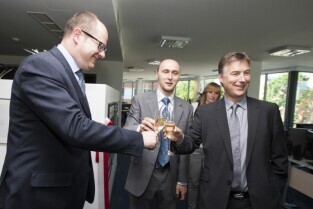 Otwarcie nowego biura Fineos - irlandzkiej firmy działającej w branży IT. Gdańsk Wrzeszcz, biurowiec w kompleksie Garnizon. Nz. od prawej: Prezes Fineos Michael Kelly, Prezydent Gdańska Paweł Adamowicz, Dyrektor gdańskiego oddziały Fineos Lech Babula