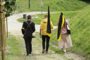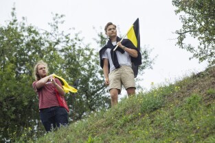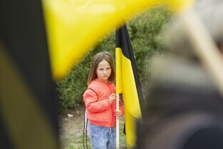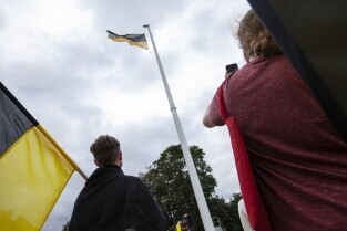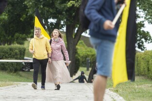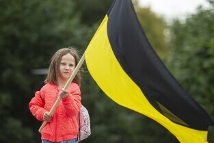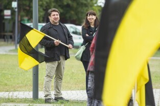 Flaga Kaszubska zawisła dzisiaj nad Gdańskiem z okazji obchodów Święta Flagi Kaszubskiej organizowanych przez Fundację kaszuby. Nz. Prezes Fundacji Kaszuby Jacek Słomion rozdaje flagi kaszubskie.