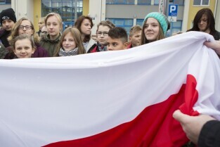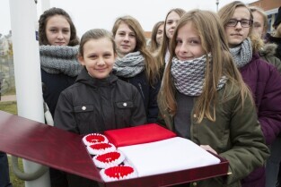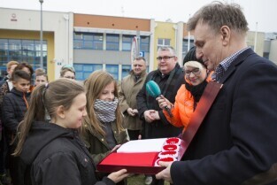 Gdańsk Ujeścisko, Szkoła Podstawowa nr 12. Uroczystość przekazania Flagi Rzeczypospolitej Polskiej z udziałem Z-cy Prezydenta Gdańska Piotrem Kowalczukiem (nz), którą ufundowało Radio Gdańsk w ramach akcji "Tydzień z biało-czerwoną flagą w Radiu Gdańsk” poprzedzającej Święto Niepodległości
