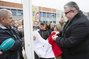 Gdańsk Ujeścisko, Szkoła Podstawowa nr 12. Uroczystość przekazania Flagi Rzeczypospolitej Polskiej z udziałem Z-cy Prezydenta Gdańska Piotrem Kowalczukiem, którą ufundowało Radio Gdańsk w ramach akcji "Tydzień z biało-czerwoną flagą w Radiu Gdańsk” poprzedzającej Święto Niepodległości. Nz. po prawej członek zarządu RG Zdzisław Koszlak