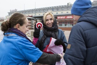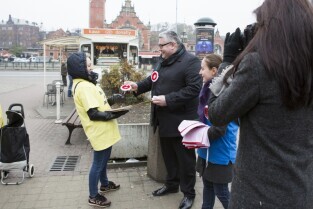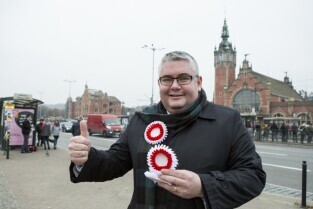 Gdańsk, City Forum. Z-ca Prezydenta Gdańska Piotr Kowalczuk rozdaje flagi i kokardy narodowe w ramach akcji "Tydzień z biało-czerwoną flagą w Radiu Gdańsk" poprzedzającej Święto Niepodległości