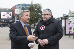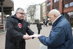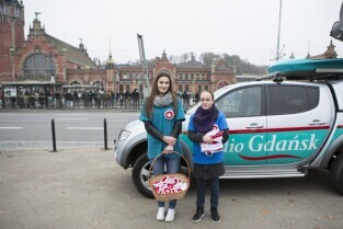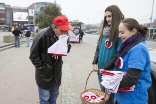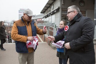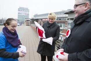 Gdańsk, City Forum. Z-ca Prezydenta Gdańska Piotr Kowalczuk (po lewej) rozdaje flagi i kokardy narodowe w ramach akcji "Tydzień z biało-czerwoną flagą w Radiu Gdańsk" poprzedzającej Święto Niepodległości