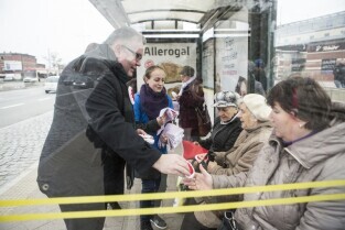 Gdańsk, City Forum. Z-ca Prezydenta Gdańska Piotr Kowalczuk (nz) rozdaje flagi i kokardy narodowe w ramach akcji "Tydzień z biało-czerwoną flagą w Radiu Gdańsk" poprzedzającej Święto Niepodległości
