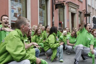 Gdańsk, ul. Długa. Flash mob wolontariuszy pomagających w organizacji finałów EURO 2012 w Gdańsku.