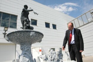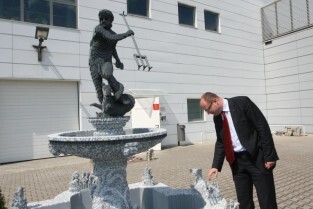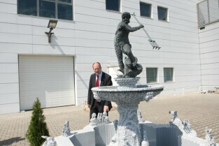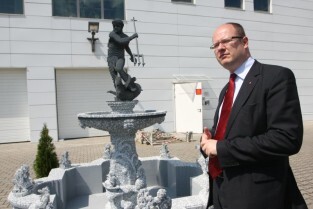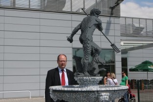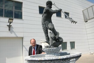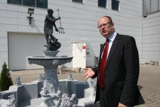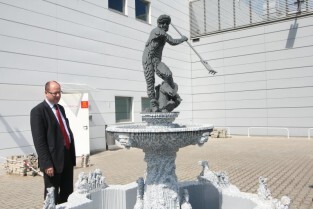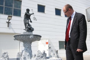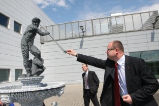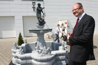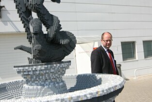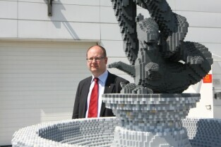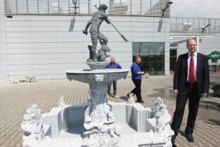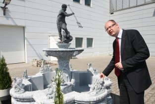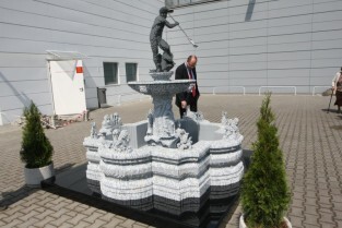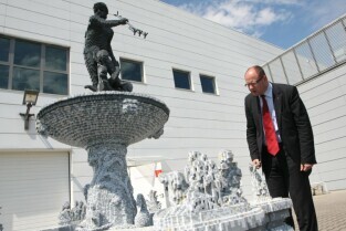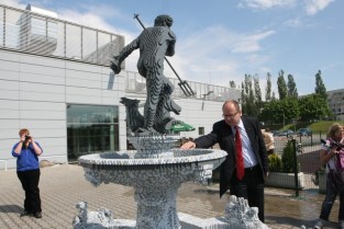 Fontanna Neptuna w całości wykonana z klocków lego (ok. 17 tys. elementów, ok. 600 kg wagi) ustawiona w Centrum Handlowym Matarnia, kilka dni przed oficjalnym odsłonięciem w Parku Nadmorskim. Nz. fontannę podziwia Prezydent Gdańska Paweł Adamowicz