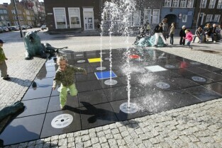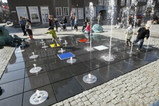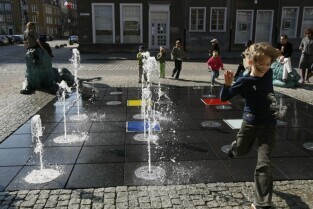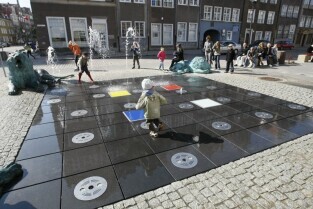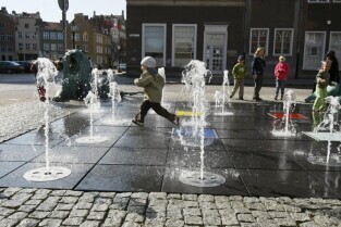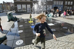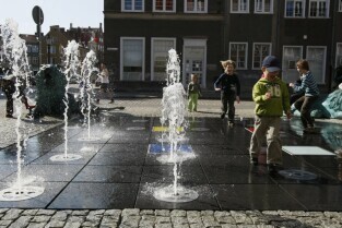 Fontanna Czterech Kwartałów na ul. Grobla I w Gdańsku po zimowej przerwie już działa. Nz. dzieci biegające pomiędzy strumieniami tryskającej wody